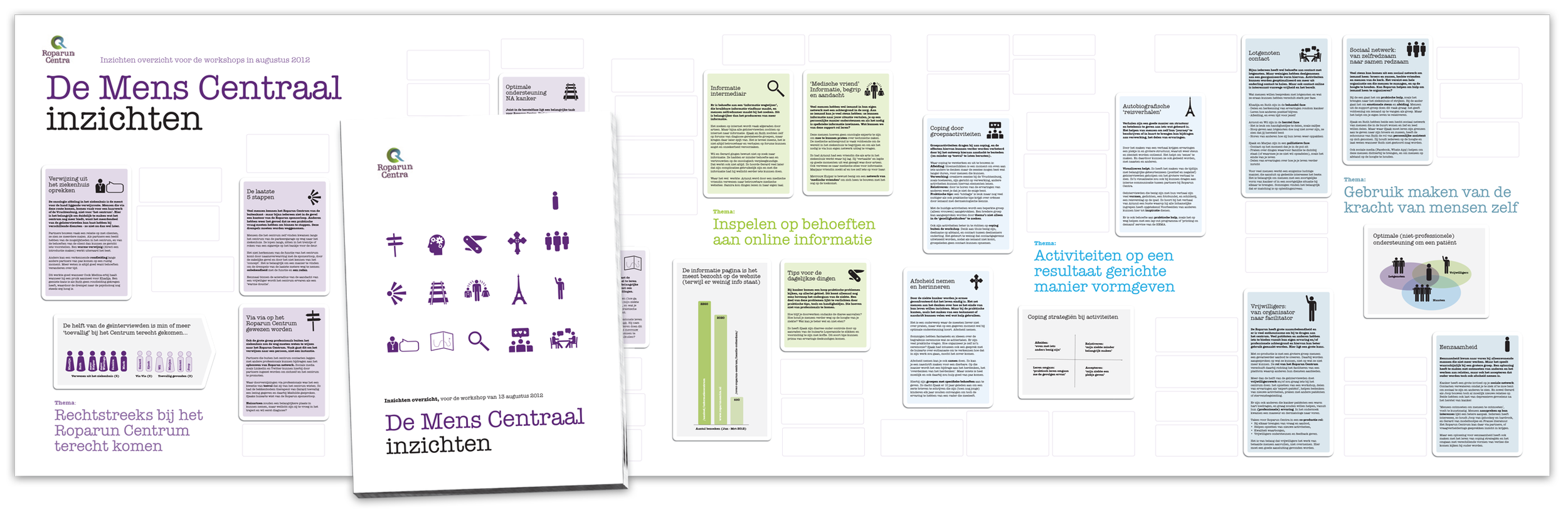 Another way to read the research insights is through three people’s journeys. The top part shows a service journey. This service journey is part of the larger trajectory of living with cancer, shown at the bottom of the poster, starting at diagnosis or onset of complaints.